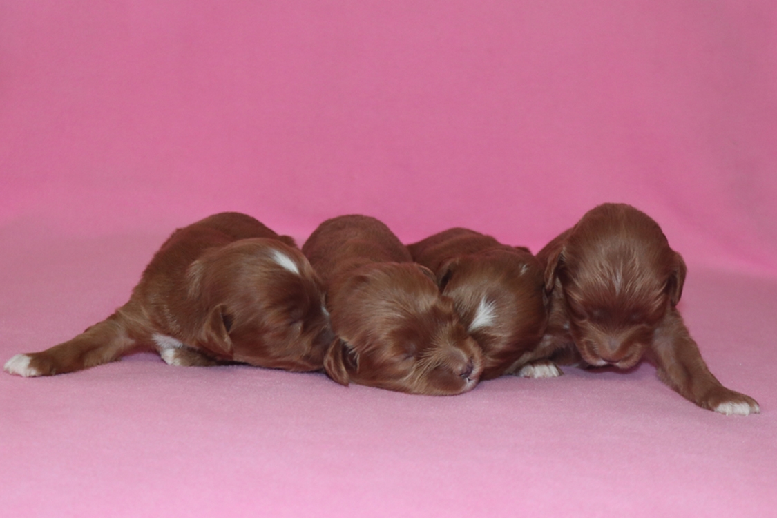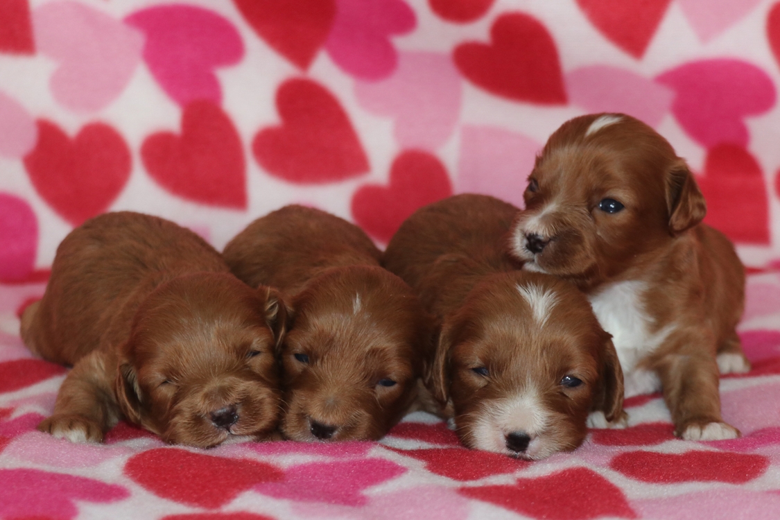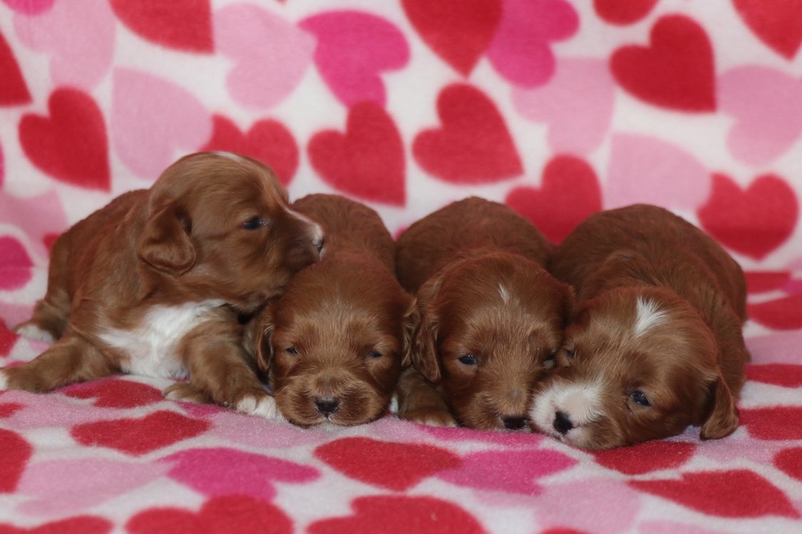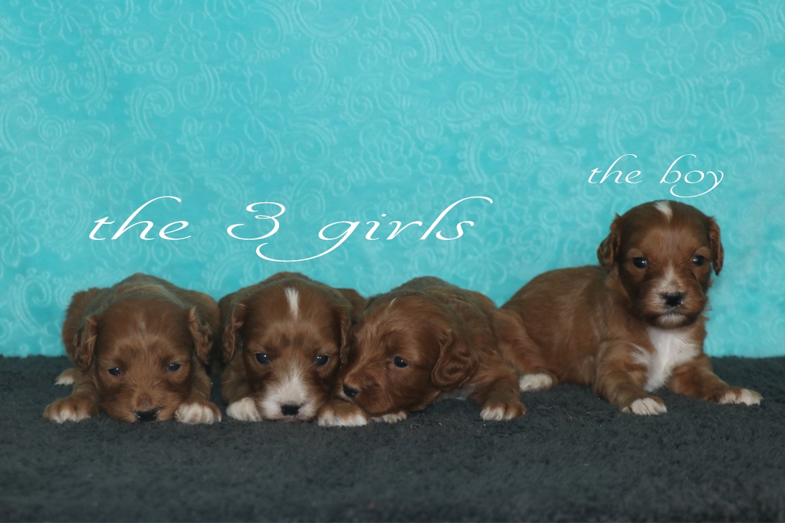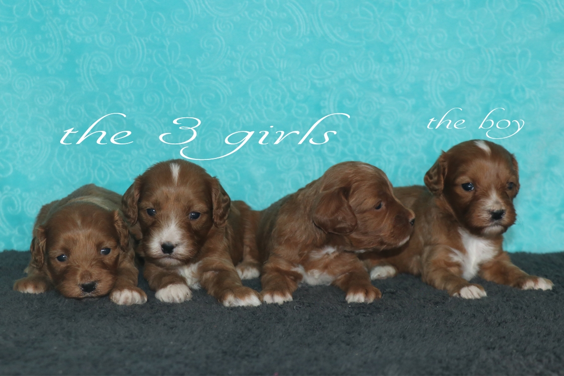 We have 4 beautiful red cavapoo babies, 3 girls & 1 boy. These precious puppies are estimated to be around 18-20 lbs full grown. Their mother Bella is a mini poodle weighing 14 lbs & their father Wrangler is a Cavalier King Charles weighing around 23 lbs. They will be ready for their new home on March 29th.