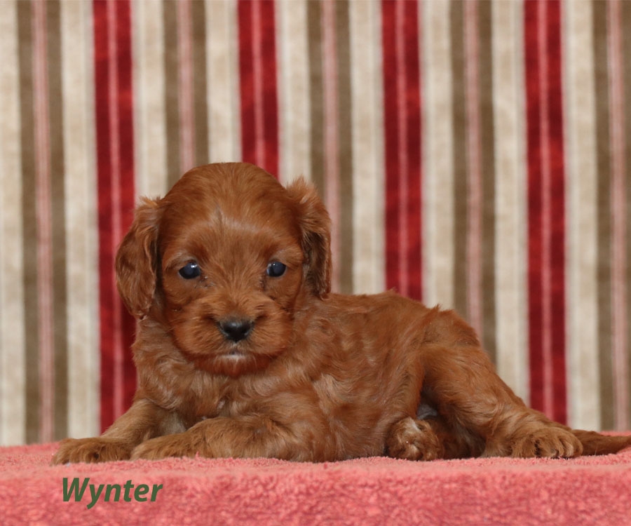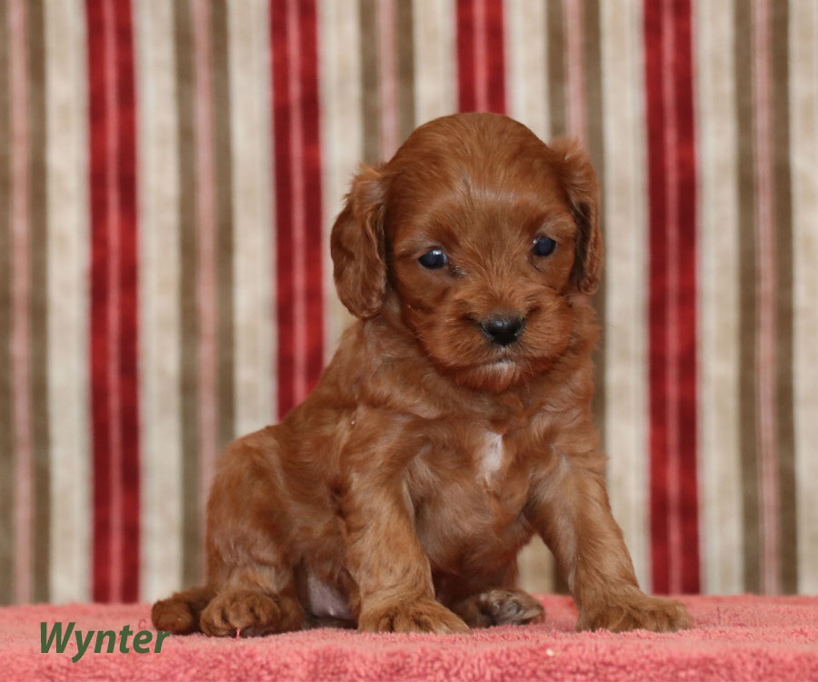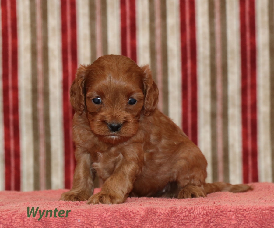 Very pretty, these cavapoos are eye catching! These little pooches have lovely thick coats and have very good hypoallergenic qualities. They are estimated to be around 15-18lbs full grown. They are ready for their forever homes on December 27.